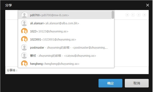 2、在下方输入或选择本域的邮箱地址(例如:cc@aliyun.com),点击确定即可。
